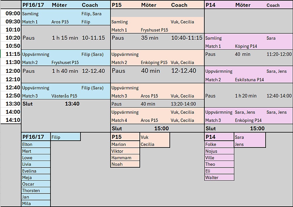Obs! Om någon blir sjuk behöver vi få meddelande om det per sms (det går bra att skicka till Sara 0735-340542). I nödfall kan vi ordna så spelare från P14/P16 hoppar in och spelar.